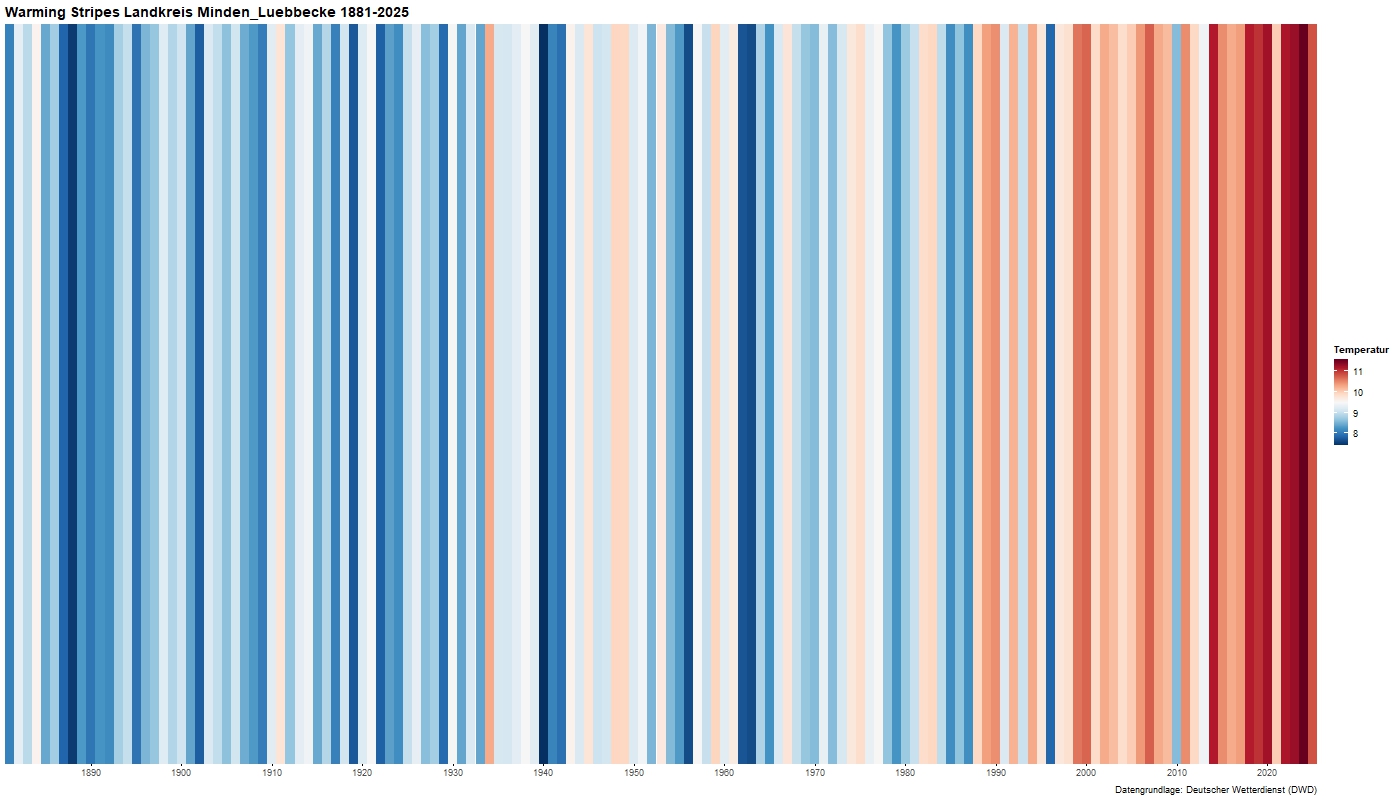 Nicht nur global gesehen – Auch im Kreis Minden-Lübbecke sind Folgen des Klimawandels deutlich spürbar. Die Warming Stripes (s.u.) zeigen die Jahresdurchschnittstemperaturen von 1881-2025. Bereits auf den ersten Blick ist für den Mühlenkreis erkennbar, dass in diesem Zeitraum eine deutliche Steigerung der Jahresdurchschnittstemperaturen stattgefunden hat.